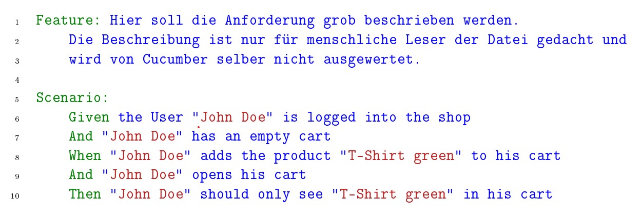 Bei Cucumber werden die Szenarios in sogenannten Feature Files verwaltet. Ein Feature File soll dabei exakt eine Anforderung abdecken und kann mehrere Szenarios enthalten. Der Aufbau dieser Datei ist dabei simpel gehalten.