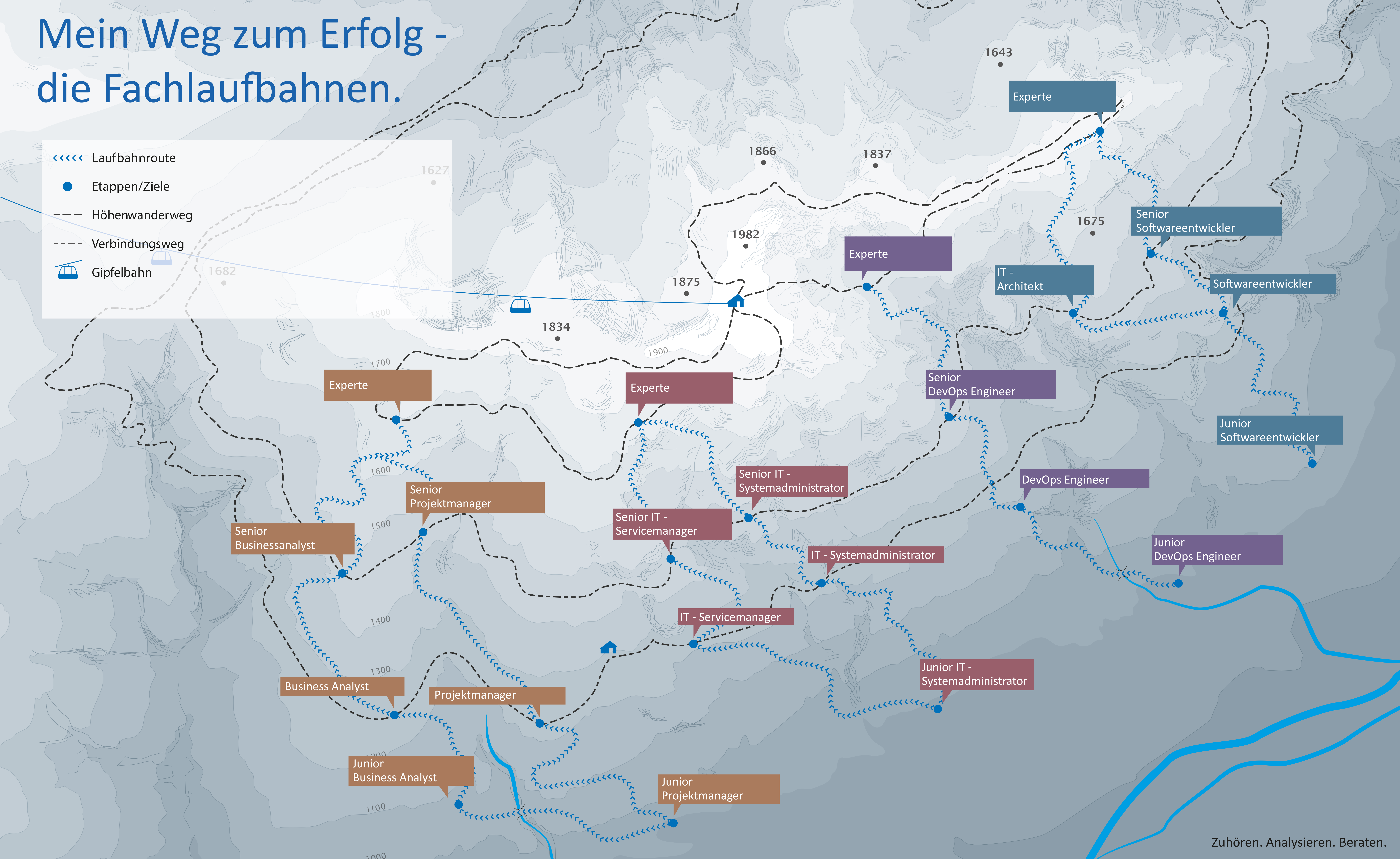 - Wir haben unser persönliches Laufbahnkonzept für Gipfelstürmer und Bergexperten. Du selbst planst Deine Route und entscheidest, ob Du eine Fachlaufbahn einschlägst, die Vertriebslaufbahn oder als Führungskraft die Rahmenbedingungen für ein wirkungsvolles Miteinander schaffst. Die Ziele werden klar festgelegt und das Unternehmen unterstützt Dich mit jährlichem Weiterbildungsbudget, das für Deine individuelle Förderung zur Verfügung steht.