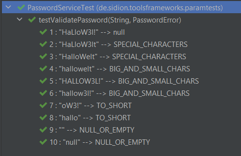 Das erste Argument bestimmt die Eingabe in validatePassword(), das zweite ist das erwartete Ergebnis. Damit stehen 9 Testfälle in 9 Zeilen Code direkt unter einander. Ein weiterer könnte mit einer einzigen Zeile hinzugefügt werden.