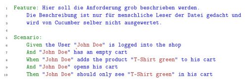 Bei Cucumber werden die Szenarios in sogenannten Feature Files verwaltet. Ein Feature File soll dabei exakt eine Anforderung abdecken und kann mehrere Szenarios enthalten. Der Aufbau dieser Datei ist dabei simpel gehalten.